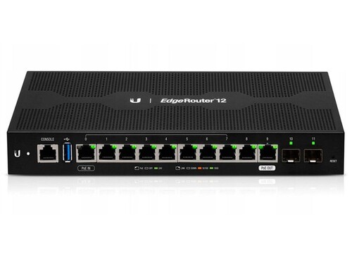 Магазин продукции Ubiquiti предлагает приобрести современный маршрутизатор EdgeRouter 12. Технические характеристики маршрутизатора Ubiquiti EdgeRouter 12: максимальное энергопотребление 20 Вт (без раздачи PoE), 4-ядерный процессор MIPS64 1 ГГц, 10 портов 10/100/1000 Мбит/с и 2 SFP порта 1 Гбит/с, производительность Layer 3, размер 268.1х136.5х31.1 мм, ОЗУ 1 ГБ DDR3 RAM, вес 700 г и возможно крепление в стойку при помощи дополнительных креплений. Доставляем роутеры Ubiquiti ER-12 по всей Украине.